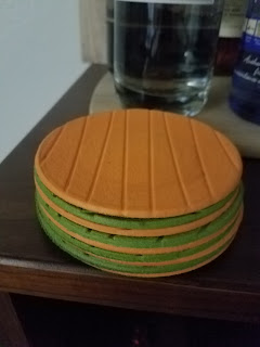My brain develops a tic, that's what happens. Notice that the bottom coaster, the orange one, is not strictly part of the stack. I couldn't even bring myself to put the two orange ones directly on top of each other. That bottom one is there in case we need it, but I can't bring myself to disrupt the pattern of the rest of the stack. I just can't. We'll find that green one, and all will be right in the world again.